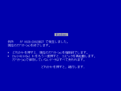 9x系のブルースクリーンでは、実はブルースクリーンから元のOSの画面にもどることができたんですね。(昔そういえばしょっちゅうブルースクリーンから復旧させて使っていたのを思い出しました。)