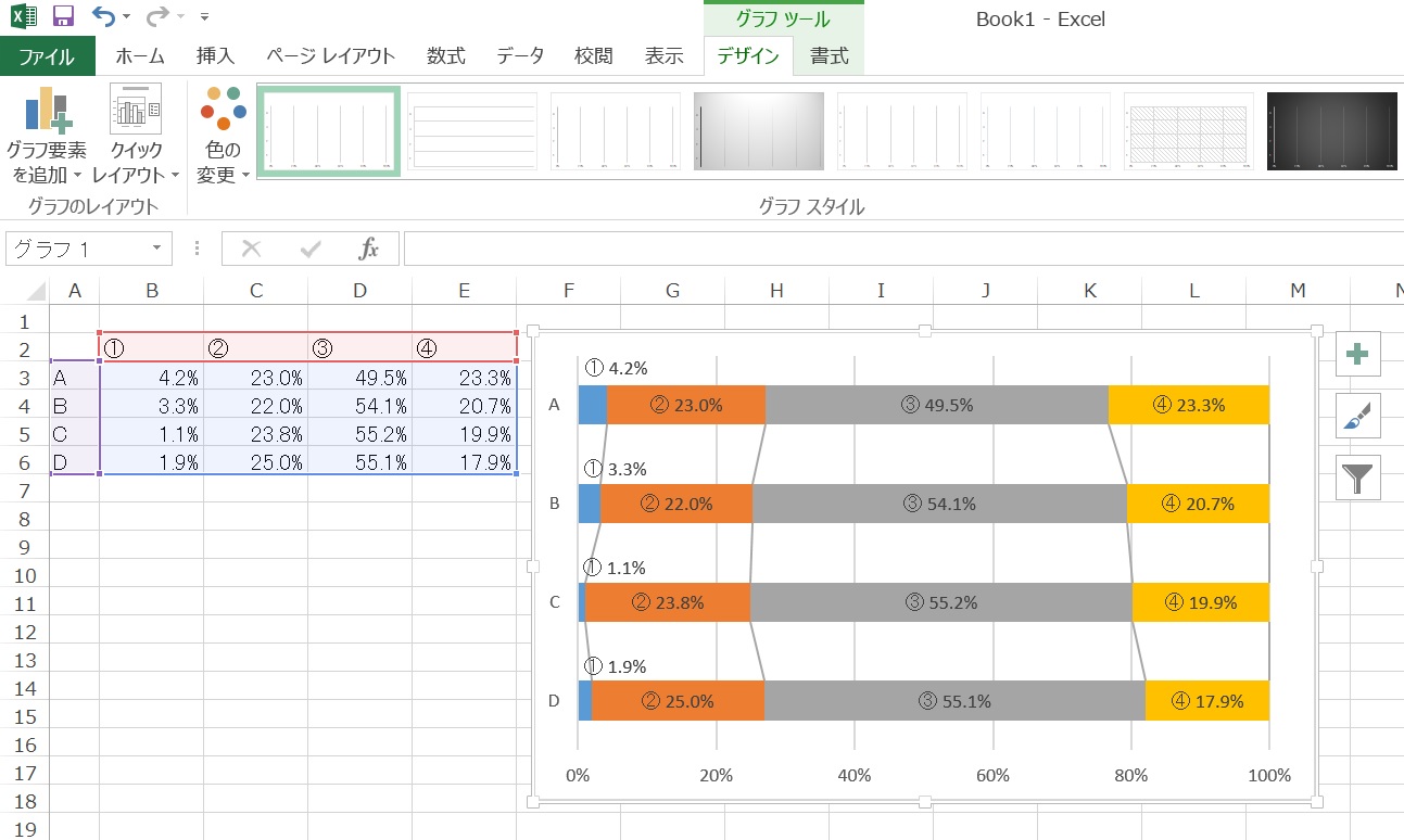 編集したいグラフを選択すると、「グラフツール」という項目が上のメニューバーに追加されるので、その中から「デザイン」のタブをクリック。