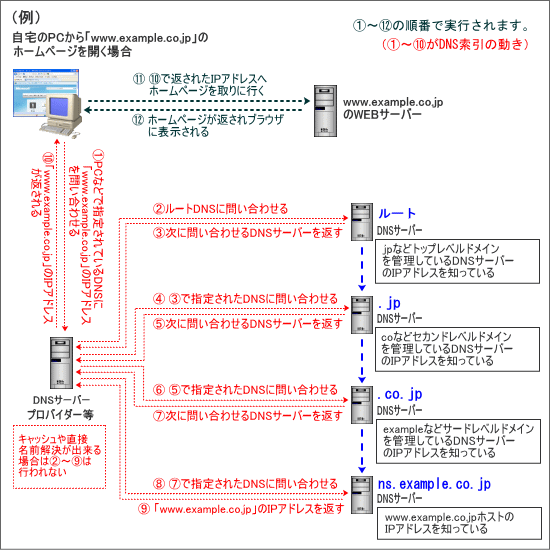 例として、DNSの仕組みをexample.comというドメインのIPアドレスを調べるときの流れをおって説明します。