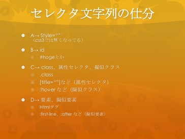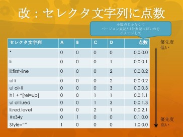 図の様に指定方法の種類別総和が優先度になっています。この優先度の特徴として、IDの様なより詳細な種類の指定方法が用いられていた場合、どれだけクラスの様なより詳細でない種類の指定方法を重ね掛けても優先度で上回れないという点があります。優先度が同値の場合、後から読み込まれた方が優先されます。