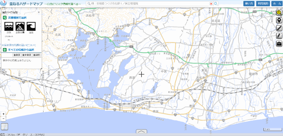 主な使い方は簡単です。左上の災害種別で災害毎の影響範囲のまとめを地図上に写して見る、右上の危険虫眼鏡で調べたい場所をクリックしてその場所のリスクを見る、これだけです。