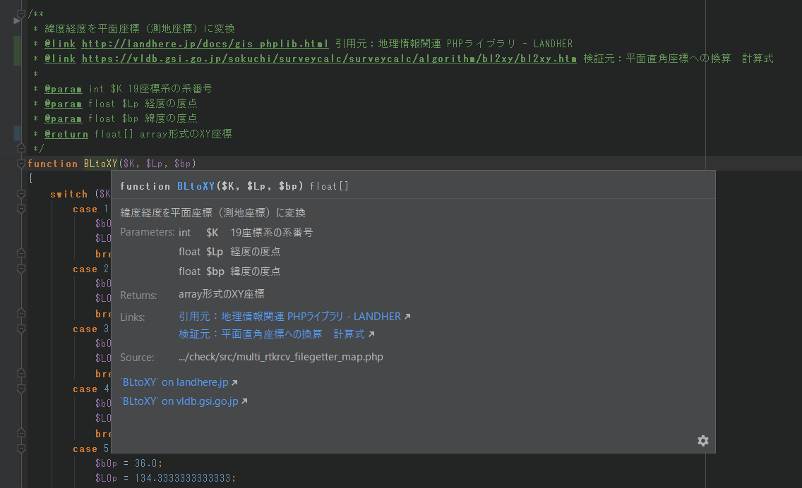PHPDocはphpには関数を表すためのコメントの形式として用意されているフォーマットです。PHPDocの形式に対応したコメントはIDEの様な多機能エディタでPHPファイルを編集する際に、読みやすい形になって出力されます。例えば次の様になります。