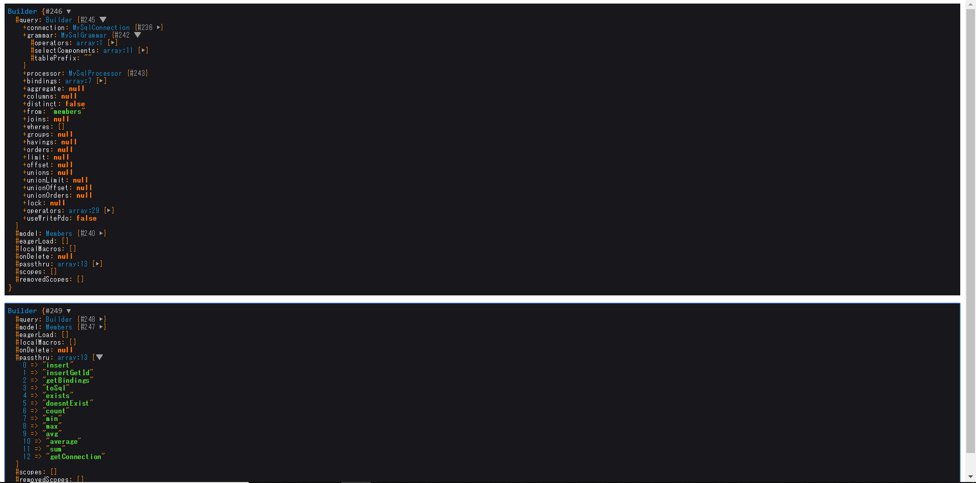 ここでSymfonyのvar_dumperに渡してLaravel自身のコードは終わります。Symfonyのvar_dumperの中は満足いくeleganceな表示を行うためにいくらか大きな処理をしています。CliDumper.phpだけで600行程、htmlDumperは900行程で記事に書き起こす程読み込む気力はありませんでした。