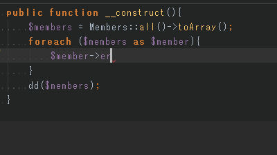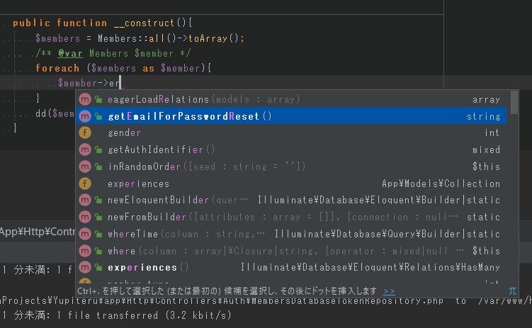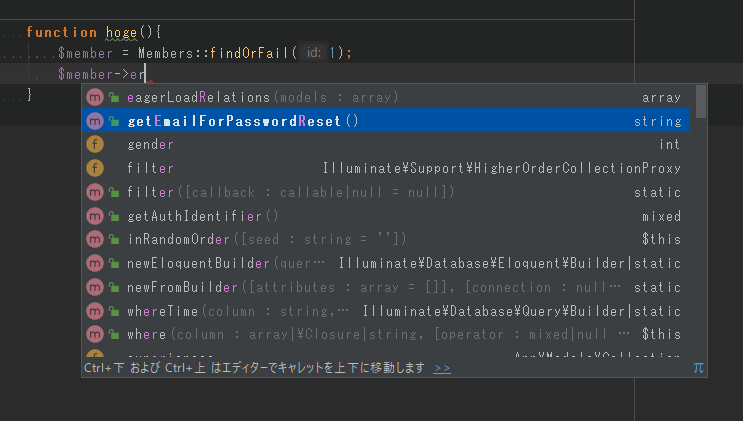 このPHPDocコメントを書くことによって$memberはMembers型であるとIDEに示すことができ、IDEは型による補完機能を動かしてくれました。
