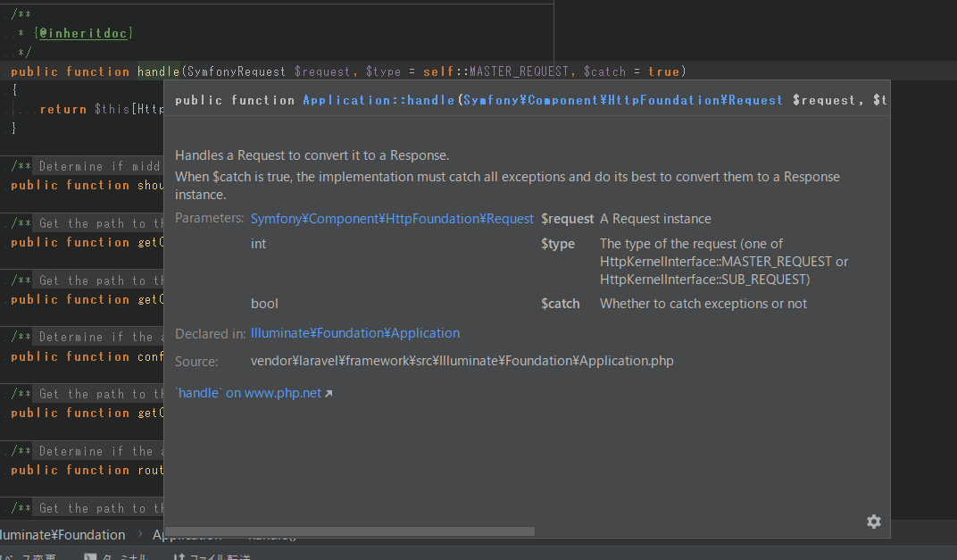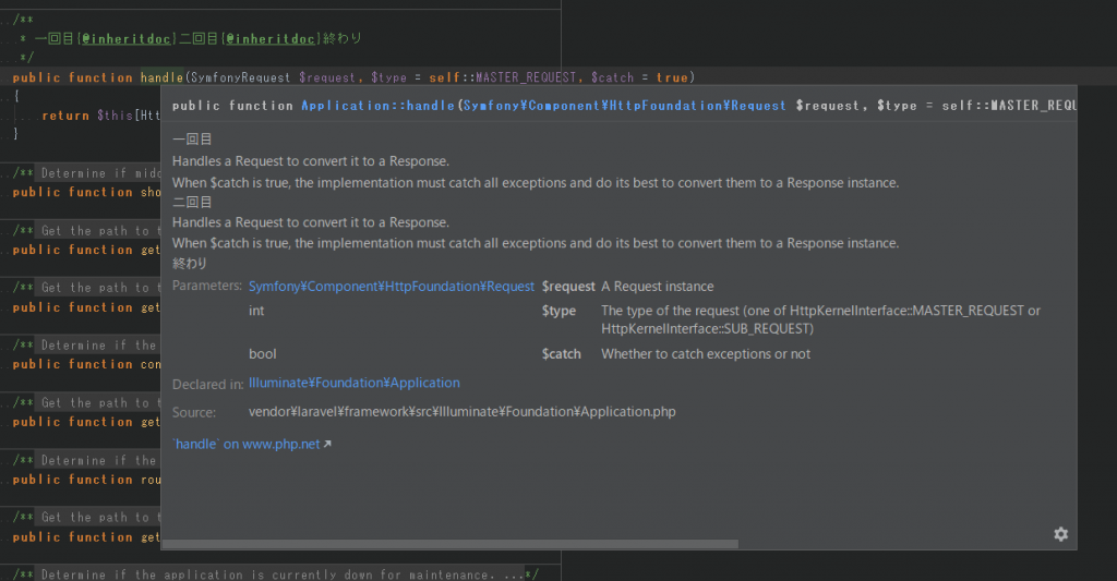 @inheritdocは継承元(implements元やextends元やtrait元)のPHPDocの説明を継承するタグです。@inheritdocを使うと次の様に継承元のPHPDocの説明文を受け継げます。