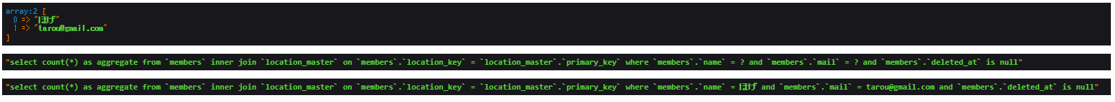 ログに残すメッセージはstr_replace_array(‘?’, $query->bindings, $query->sql)です。$query->bindings、$query->sql、str_replace_array(‘?’, $query->bindings, $query->sql)の中身はそれぞれ次の画像の通りです。