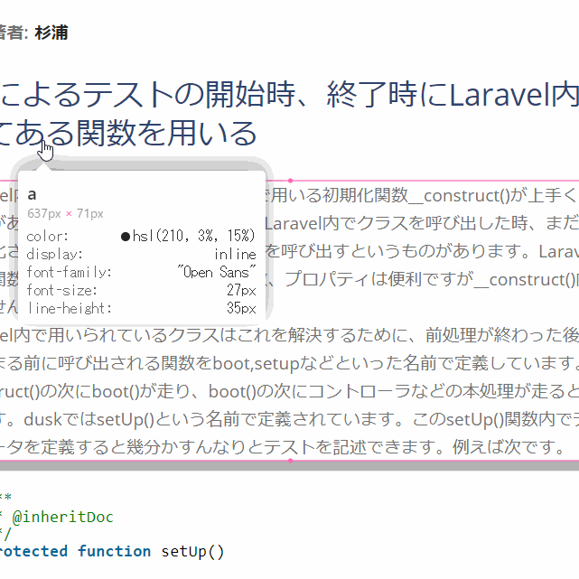Inspect機能は要素のスタイルを簡単に次々見ることが出来ます。Local Modifications内ではVisBug自身で編集したデザインを表示しています。横着ですが、ここで作ったデザインの値をそのままコンポーネントなどのスタイルにあてることで深く考えずに自在なデザインを作れます。