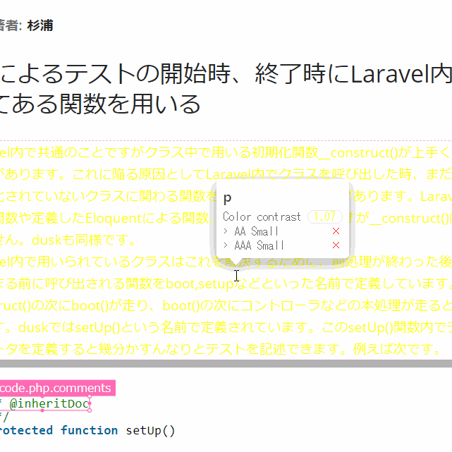 Accessibility機能はその要素が人間の目にとってどれぐらい見やすいかを表示してくれます。数字が大きいほど見やすく、図の白字に黄色なんかはとてもよろしくないです。AA、AAAといった指標はWeb Content Accessibility Guidelines (WCAG) 2.0に定められた閾値です。