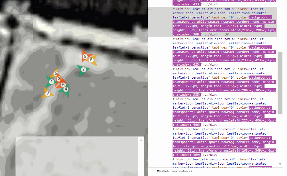z-index:4の要素の上にz-index:3やz-index:1の要素が描画され、z-index:5の要素がz-index:6を差し置いて最前面に描画されています。これが親の上に子のルールによるものです。z-indexもまた階層構造になっており、描画順はz-index-levelの記述の様に親子を考慮した辞書順で考えるのがわかりやすいです。地図をwebページ上で描画するLeafletなどはこれを特に利用しています。下図の様にとんでもない勢いで位置の上下に合わせてz-indexを変更していますが、地図ノードコンテキストの上でのみのz-index操作なのでバグの原因になることは滅多にないです。
