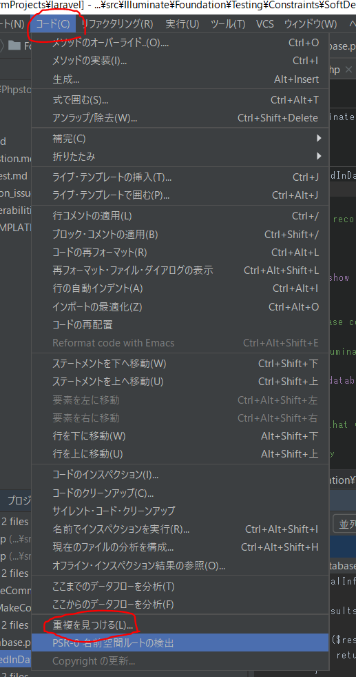 次の画像にある重複の分析を選ぶとPhpStormはコードを解析しコードの重複を見つけ出します。