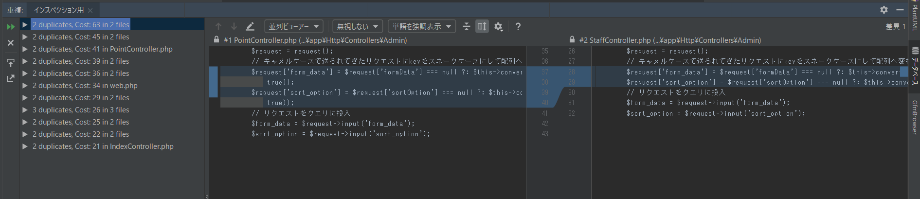このまとめられた関数の配置をそのままなり、traitなり、他クラスなり、親クラスにして他の重複部分から呼び出すことによって重複コードのリファクタリングが成ります。重複が同ファイル内にあるならばPhpStormがよしなにまとめてくれます。