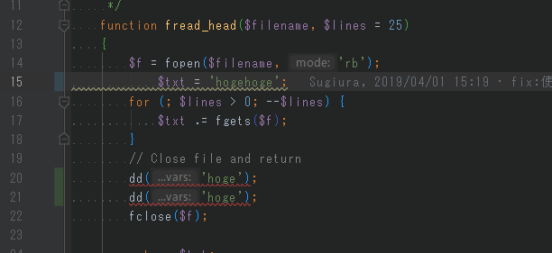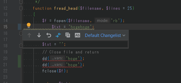 PhpStormはコーディング画面のままGitに関連した便利な操作ができます。画像の様な差分を表す部分をクリックすると変更前のコードが現れます。ここからショートカットで色々できます。 よく使うのが差し戻しとコピーです。差し戻しは次のgifの様に戻るアイコンをクリック。この部分だけgitのhead部分のコードに戻せます。 コピーはgifのようにメモアイコンをクリック。変更前後の動作の比較などに便利です。 他にも差分へ移動、詳しい変更点の強調など細やかな操作が可能です。