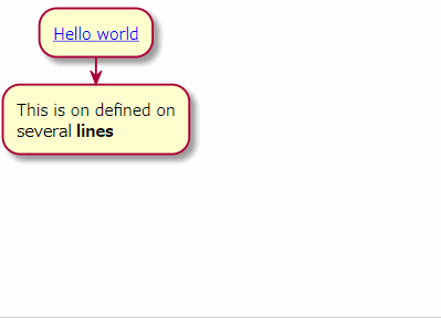 PlantUMLに次のように書くことで図のようにハイパーリンク付きの文字列を作れます。使える場所はかなり広く文字列を表示する場所ならどこでもOKな印象です。今回はpumlファイルのあるフォルダと同じ場所にsvgファイルを展開するつもりなので、記述中のpumlファイルの場所からみた特定のpumlファイルへの相対パスを記述します。