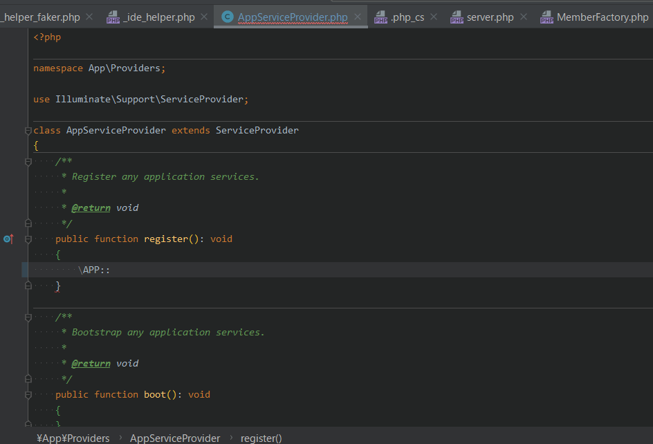 この仕組みのカラクリは実は簡単です。実行されることのないグローバル配下ファイル(大体プロジェクトルート直下)にnamespace, class, methodの定義を列挙しているだけです。グローバルで参照されるファイルに記述されているため、どこからでも定義が合算して扱われるようになり補完機能が働くようになります。_ide_helper.phpというファイル名はわかりやすさのためにつけられているだけで*.phpなら何でも問題ないです。