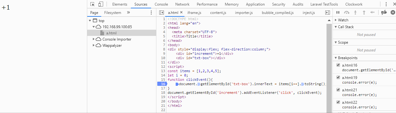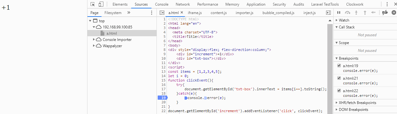 なぜエラーになるかを調べる時にブラウザ上のブレイクポイントが使えます。しかし、上プログラムの様にエラー原因となった行と同じ場所を何度も通るプログラムでブレイクポイントを進めるのは億劫です。どのくらい億劫かは次動画で示されます。