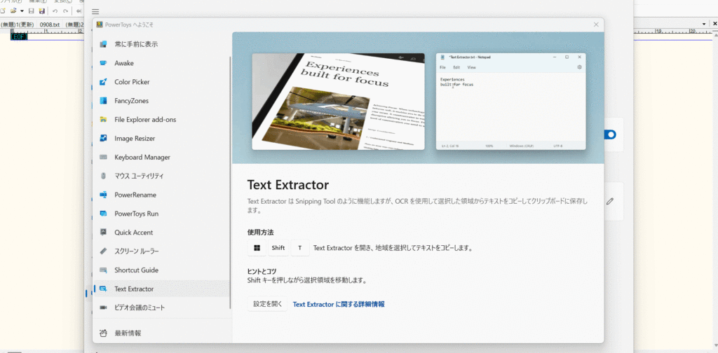 PowerToys をインストールが済んだらもう Win * Shift + T で使えるはずです。ダメなら PowerToys の設定から Text Extractor の有効化ができているか確かめましょう。
